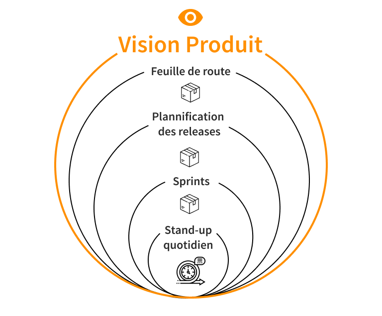 La vision du produit fixe le cap, donne du sens et décrit ce qu’on entrevoit pour le produit à court, moyen ou long terme. La vision produit est concise, souvent liée à un problème et pilotée en termes d’objectifs.
