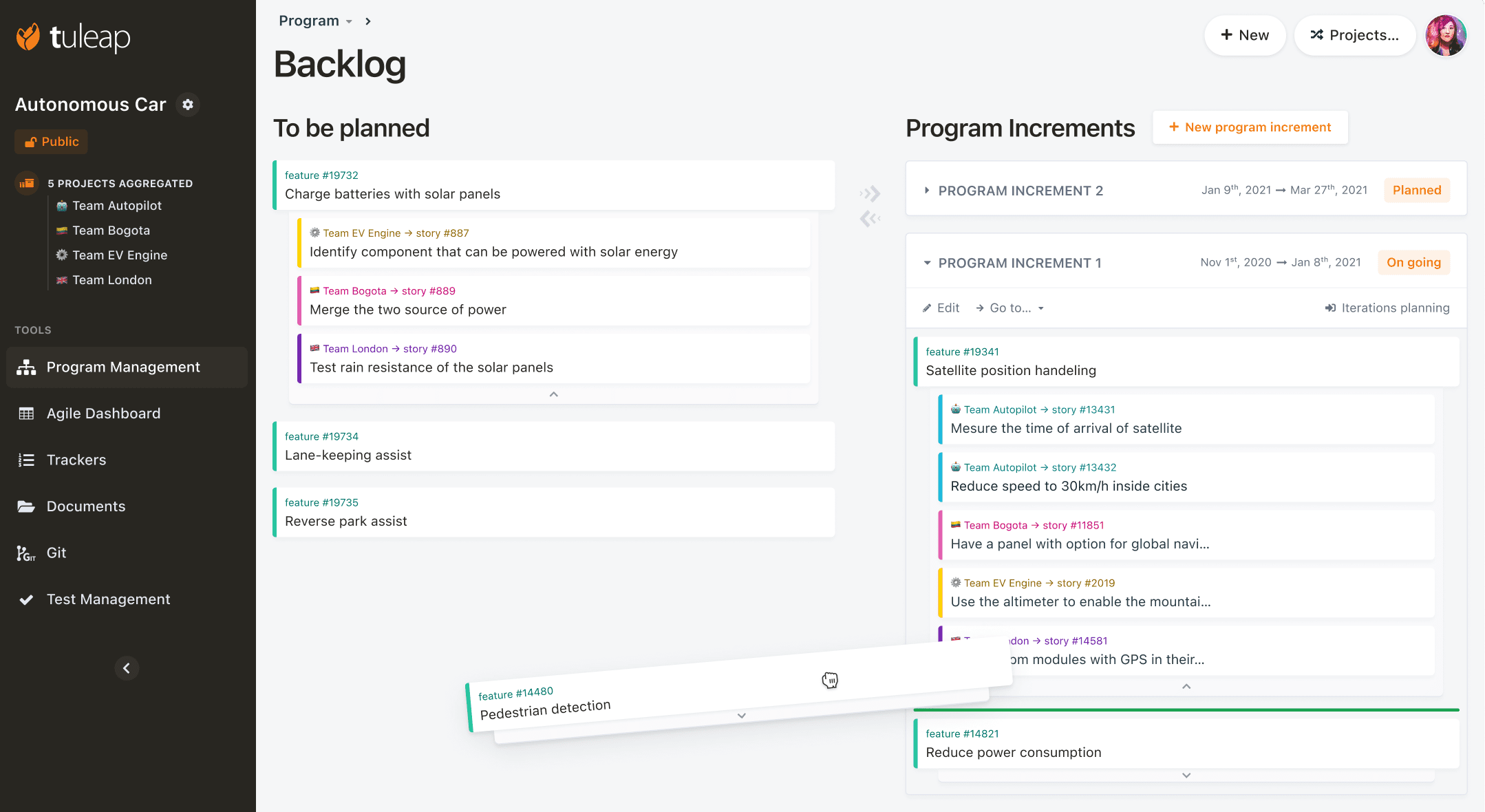 Tuleap provides dependency boards and alerts to quickly identify and resolve cross-team blockers.